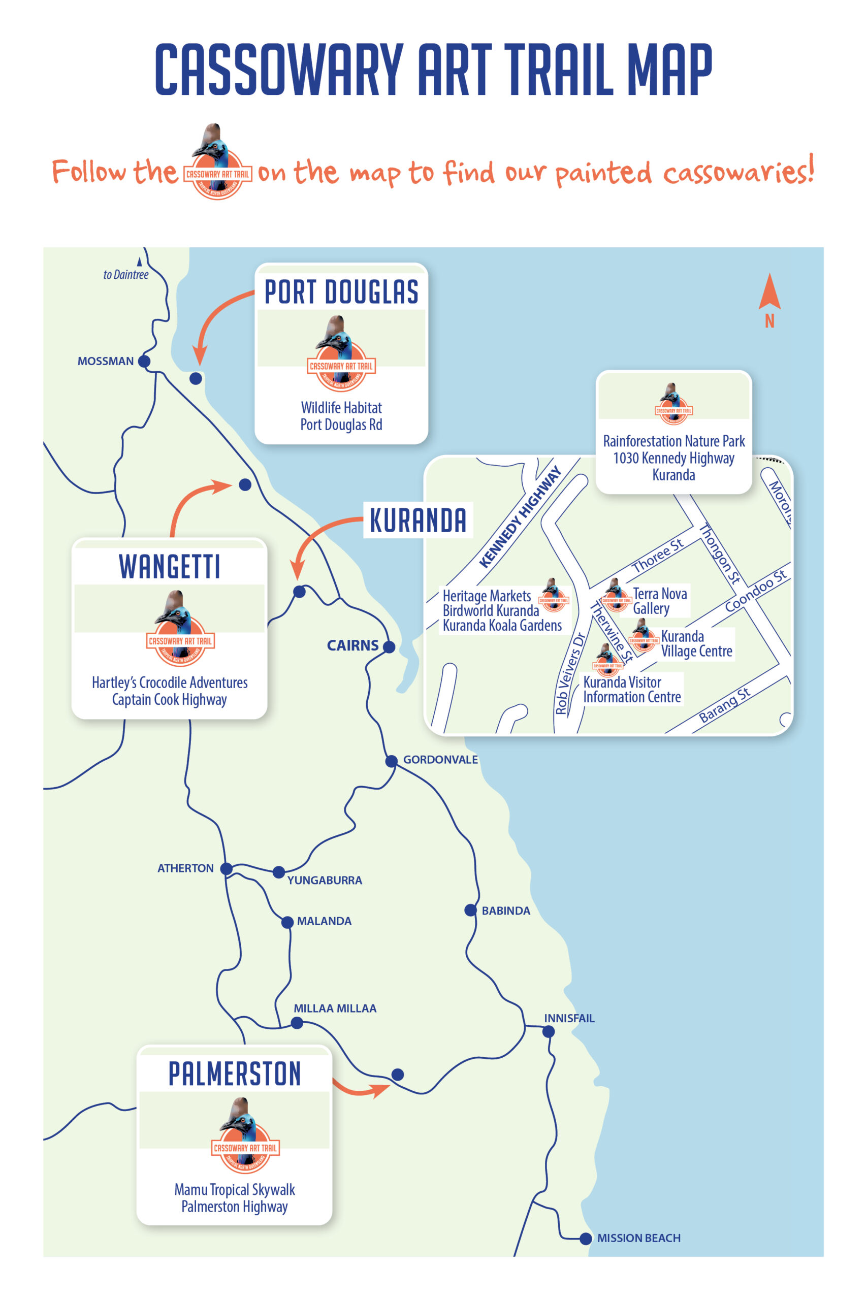Follow the Cassowary Art Trail on the map here. Interested in learning more and/or making a donation to the Cassowary Art Trail? More information can be found at https://www.cassowarytrail.com.au.