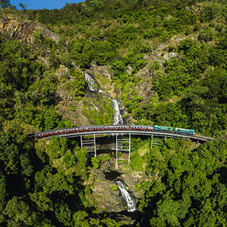 You’ll be transported back in time from the moment you step aboard Kuranda Scenic Railway’s vintage timber carriages, some more than 100 years old. Travel through the heart of Din Din (Barron Gorge) National Park and discover the wonders of this ancient rainforest. Rising from sea level to 327 metres, the views of deep ravines, mountains, and Cairns extending to Great Barrier Reef islands are nothing short of spectacular. You’ll pass through some of the most amazing scenery in Tropical North Queensland during this two-hour train journey. It is an unmatched experience through one of the world’s oldest rainforests along a heritage-listed railway line operating since 1891.